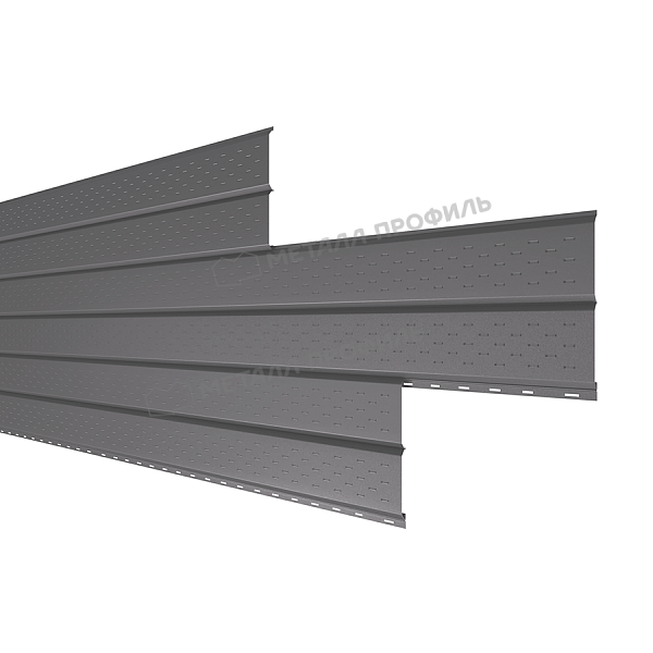 Софит — это специальные панели из серии Lбрус, оснащённые перфорацией на лицевой стороне. Они предназначены для подшивки карнизных свесов кровли. Благодаря аккуратному внешнему виду софит придаёт зданию завершённость и эстетическую целостность. Перфорированные отверстия обеспечивают вентиляцию подкровельного пространства, предотвращая скопление конденсата, а также развитие плесени и грибка.
